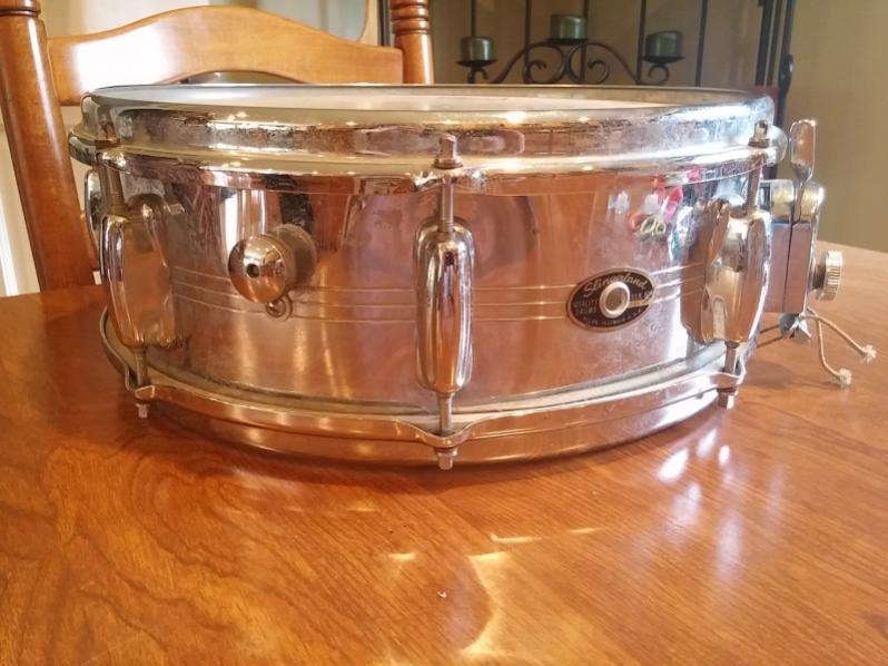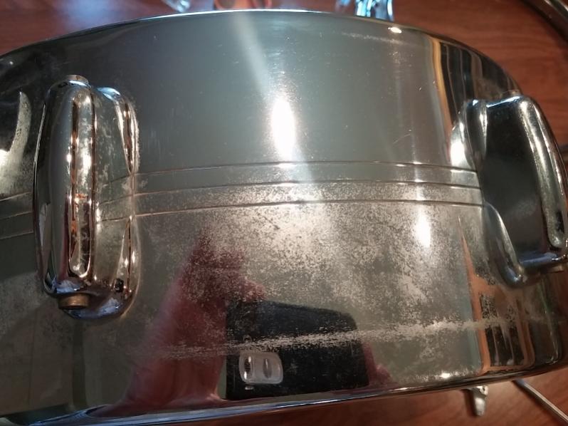 Goodwill score...mid to late 60's COB. Only had my lunch hour to peek and poke at it. Took a lug off just to verify, and saw that nice brassy reflection in the hole! Appears to have original heads, a Zoomatic that actually appears to not be broken or overtorqued, not sure about the snares though...a really dull battleship gray. One small indentation in the shell that has an appointment tonight with a curved piece of wood on my workbench. The first pic is just a quick once over with a microfiber cloth. It came covered in a greenish-whitish haze of years stored somewhere that promotes the formation of greenish-whitish haze! The second pic is a non-paid advertisement for Never Dull...I will let you guess which section got the quick treatment... :)