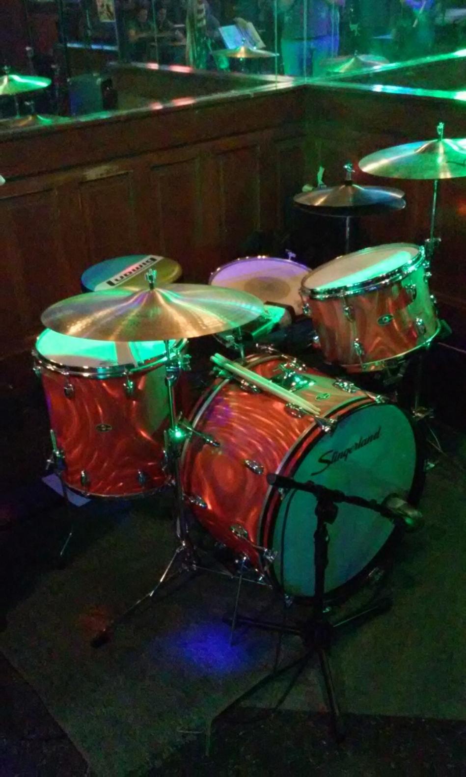 Here's a picture of my newly aquired Slingerland red satin flame kit at it's first gig. They look and sound fantastic! Everyone loved them, especially this little drummer boy.Keep on Pl