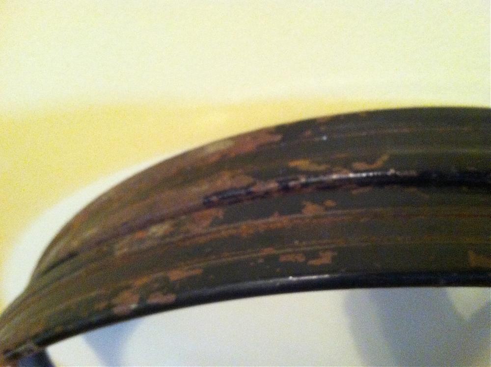Started with the worst one, the snare. It had the most rust, missing parts, muffler knob pulled right through shell etc. The shell had factory re-inforcing pieces of wood where there was anything mounted through the shell. except where the muffler was. Found some 1/8" luan at work, laid it on top of a steam humidifier we also had at work, got it nice and soft so it would conform to the shell, glued, clamped, Wallah!! pieced together muffler but had to make a plate for the outside of the shell. Very happy with the outcome. Still have to pick up some snare wires and see how it sounds...Rich.