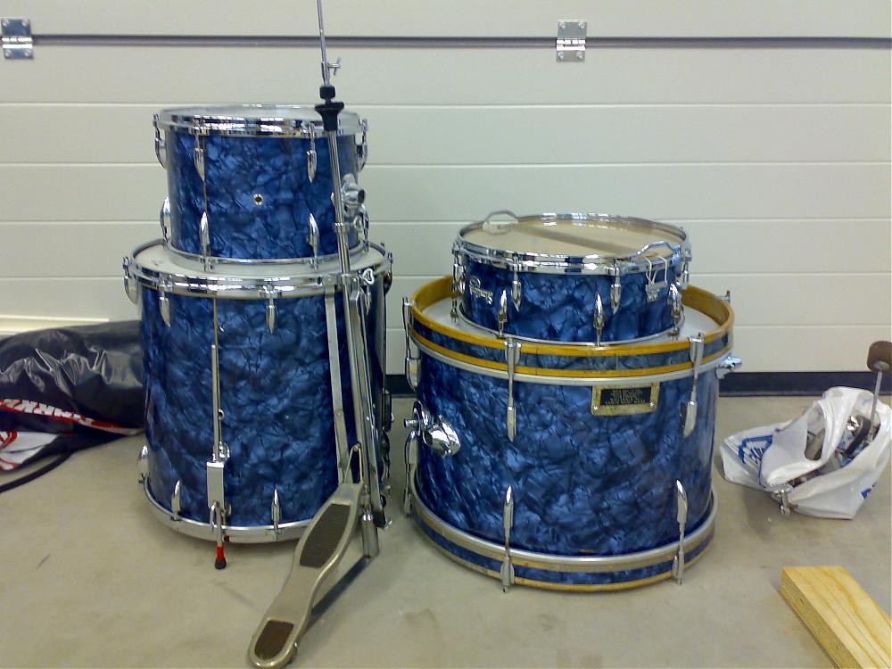 That much I found out, that I have the "Shaftesbury"-outfit with Marine Pearl finish. Kit also contains original hihat- and snare stand and bass drum pedal.