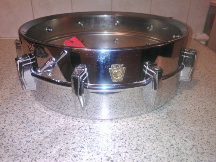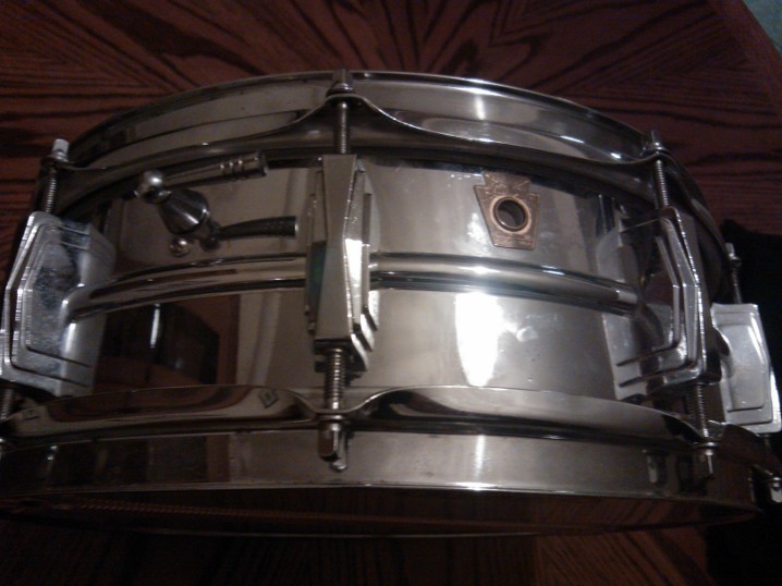 Hi guys, I'm new around here and was hoping to get a little more info on this Ludwig Supraphonic snare that I have here. I bought it a few years back from a local drummer and was wondering if everything on the drum is period. The serial is 116131 making it a 1964 drum according to some online sources. It has the red felt muffler with the baseball bat tone control and p-83 snare throw-off. It's the hoops that I'm not too sure about. They're chrome over steel and to me they don't seem 50 years old. The snare gates are the type you'd see on a later Supra or Acrolite. I find if I tune the reso head up high there is very little room for the string to pass through the snare gates.