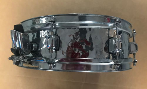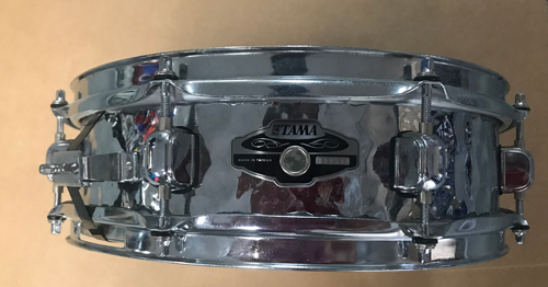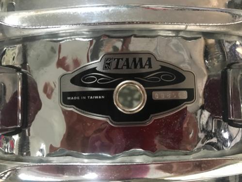 Thanks for the pictures! I tracked down this exact drum in the Tama 2003 General Catalog. It's listed in the Hammered Steel Shell "Soprano" snares, model PF140H13 with a 1mm steel shell. Shows the exact same hardware and badge, too. Hope this helps.-Mark
