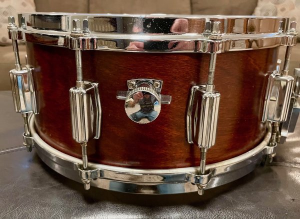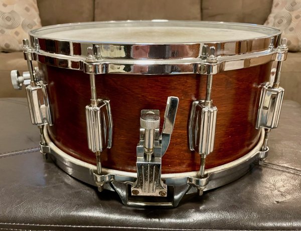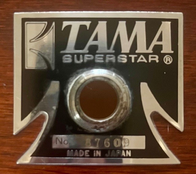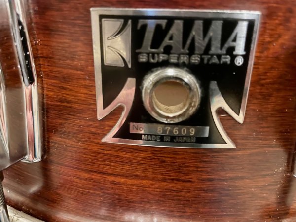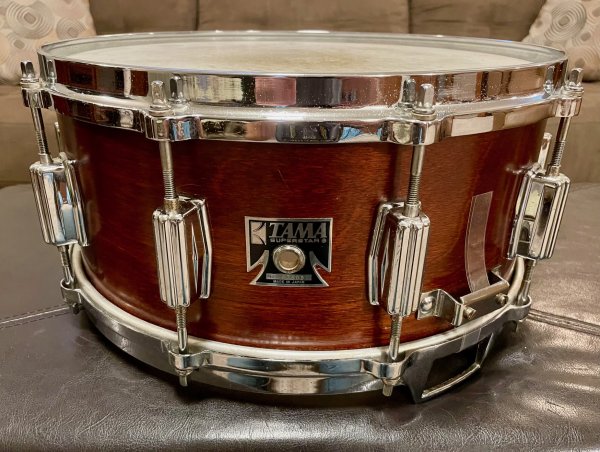 Nice drum. It's a late 70's No. 9676 Superstar in either Natural Walnut or Custom Mahogany finish depending on when it was made. They were available in Natural Maple or Natural Walnut in the '77 catalog and Natural Maple and Custom Mahogany finish in the '78 catalog but the shells were Birch in either case. I suspect the Walnut and Mahogany finish was the same, they just changed the name, but I don't know that for sure. These were matt finish which is what yours appears to be. The shell is Birch with Birch ply re rings. Not a very common drum as Tama was just starting to make professional level drums. It appears to have all of its original parts and is in great shape.