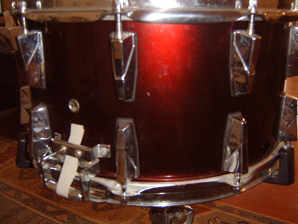 here are some pics of the trak snare, 10 lugger well made, plays well, on closer inspection it appears to be a rewrap which suggest who ever owned these drums wanted them all the same colour, guess i'll have to unwrap this snare as well as the rest of the kit and see what i get.