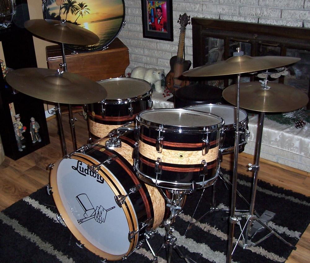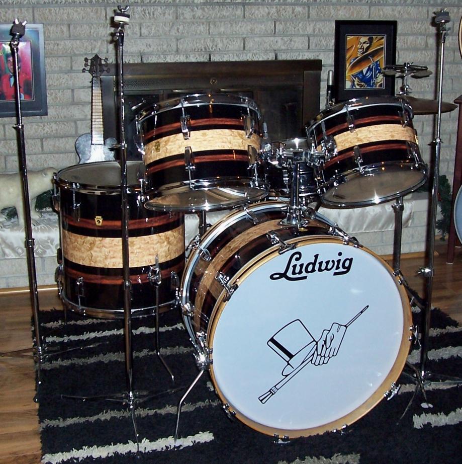 Although this isn't one of my original Ludwig kits, it was my "project" kit which kept me busy over this past winter. It was a very abused kit that was left for dead by its prior owner. I wanted to give it a little personal, "OldSchool" touch (lol), in an attempt to create a vintage, yet classy look. Since the pics were taken I was able to obtain the proper, original double tom post.