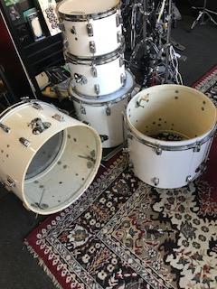 I saw this Dayton era Rogers kit at a local music shop yesterday. The sizes seem odd to me, but then again, I am a noob. They are 12,13,16,18 and 20. What is shown in the pics is all there is. So, obviously there are a few rims, a bass drum hoop, and some lugs missing. There are a some holes drilled in the bass that look like maybe a cymbal mount was there at one time?
