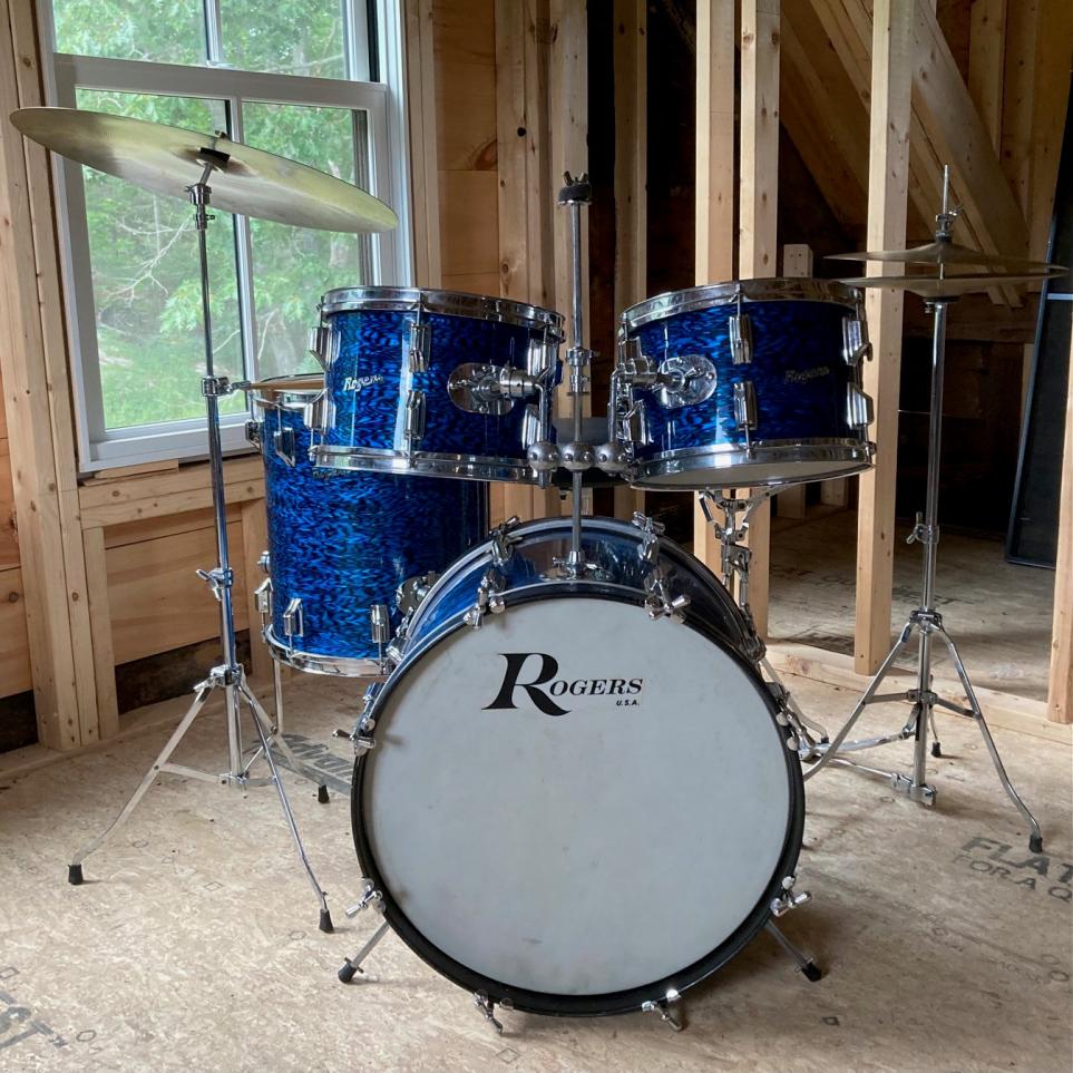This kit popped up on Reverb this morning not too far from me in Natick, MA. My son probably could have swung by this week to get it and hold it for me. It would not be too far off course on his way from work in nearby Canton. I have been thinking for some time that I'd like a satin flame set. Probably Slingy or Gretsch. But I have dutifully resisted because the last thing I need is another drum set. So thinking and acting have been divorced on the topic. But a Rogers kit that must have been refinished a long time ago (looks like the legit satin flame from way back) would be easily as good as a Slingy or Gretsch. Alas, even though just $880 with a snare, I pass for the most reasonable reason: I just don't need another kit. I am consoled by a similar kit, even though it is not satin flame.