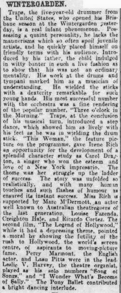 Hi, as per my previous post, I have found quite a few articles & ads from Historic press publications in OZ. I guess you would all know who "Traps The Wonder Boy" turned out to be. This clipping is from 1925 The Wintergarden being a theatre opened in 1924 In Brisbane OZ. Traps spent six months in Oz working in his parents show... I thought this to be worthy of a slot on VDF.