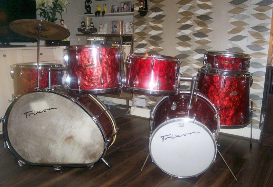 Trixon Speedfire in red pearl with teardop lugs matched with the rare early Telstar also in matching red pearl...