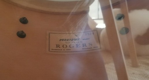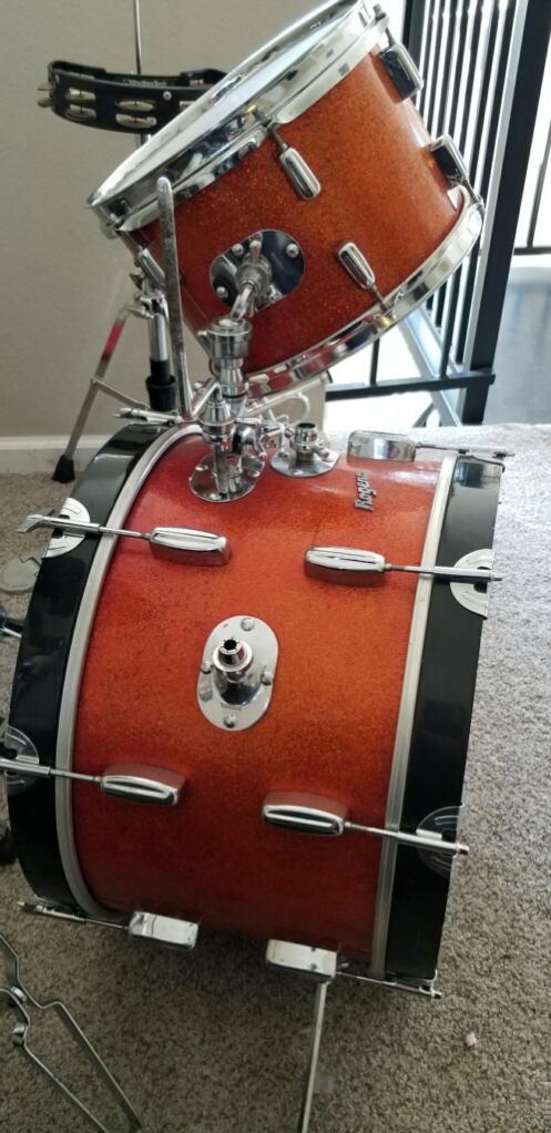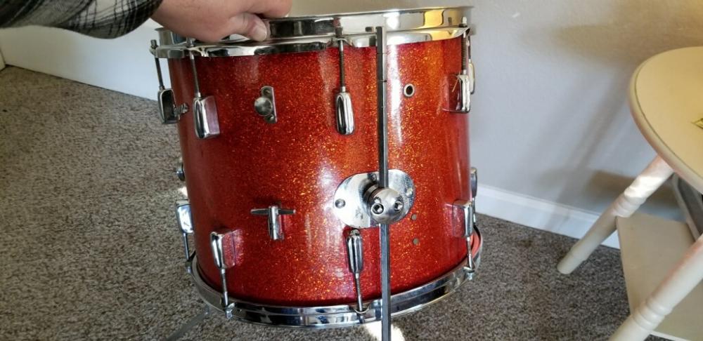 I found this kit from a guy who's selling a bunch of drums on cl. It has has an 8x12, 12x15, 12x20, must be a re-wrap, I don't believe Rogers ever offered this finish. The floor is a converted marching snare with a Yorktown tag. The 12x20 is somewhat rare from what I've heard.