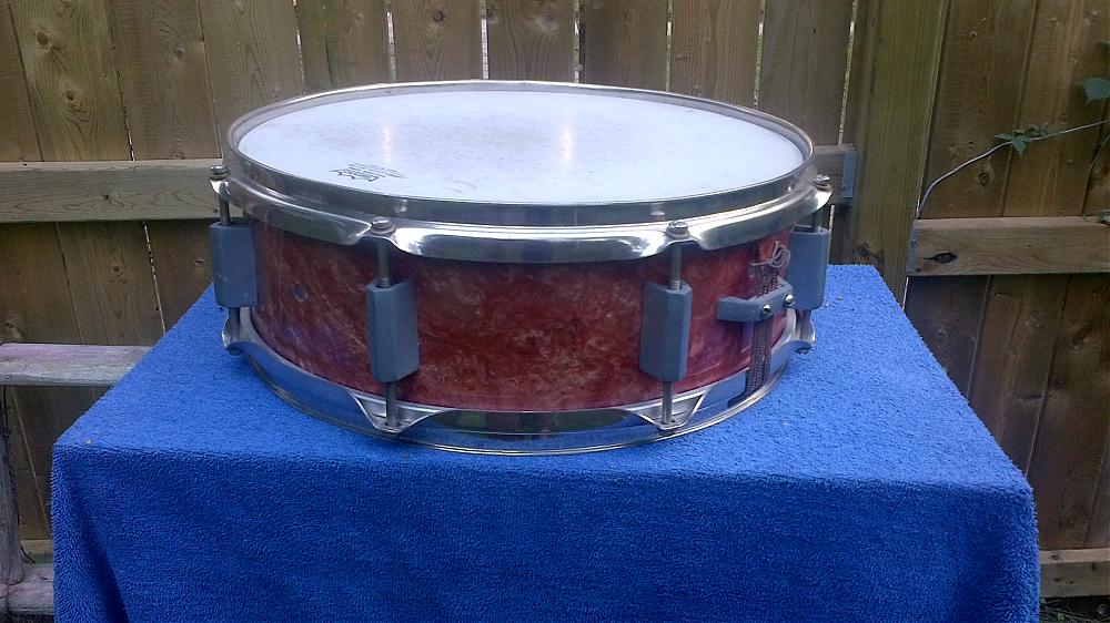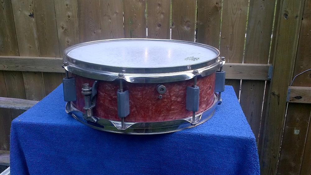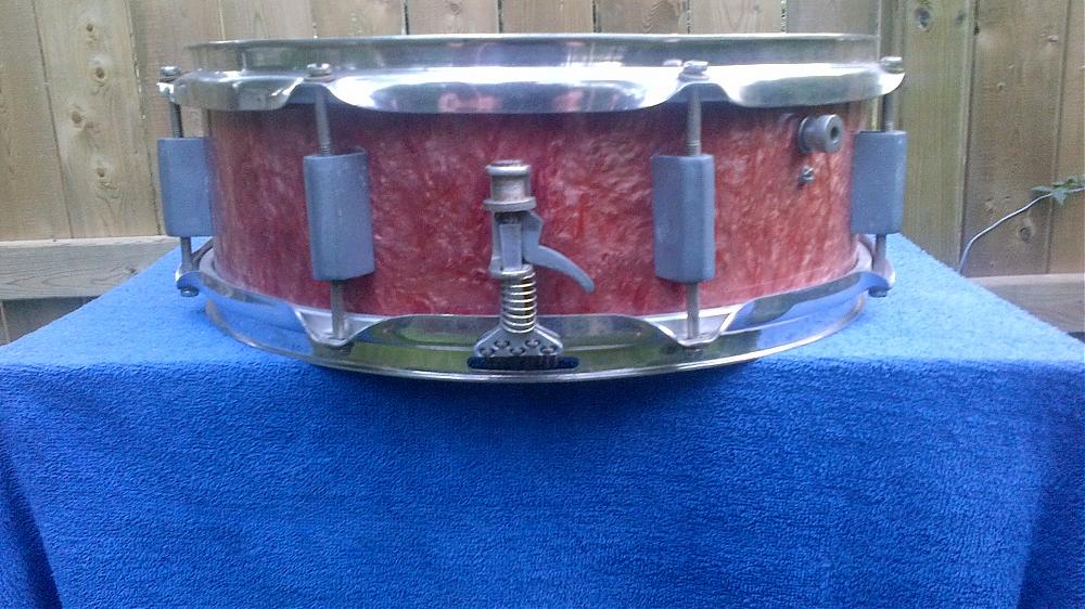 This is an odd drum that incorporates characteristics from several makers. It is a pretty standard 14 x 5 with a very pretty Salmon colored pearl wrap. Does any one know where it was made? The drum came with a really substantial offset stand----nickel plated and unusually fitted with acme threads throughout---------I don't think you would find too many stripped threads on this one.
