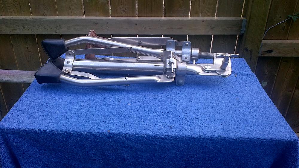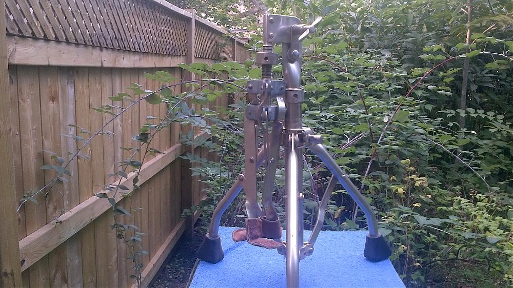 Here is the very nice stand that came with this drum. All the threads are Acme. For those of you who don't know----Acme threads are the heaviest and strongest industrial machined threads, designed for repeated threading applications,such as in presses,so called worm gears,etc.. They are designed for repeated use rather than single use or a few uses. Inadequate threads on the locking screws of stands are one of the most prevalent design flaws. The stand is super rigid with a very small footprint but enormous ribbed feet.The rubber outside of the leg is over 1/4"thick. It has stitched suede leather finger caps. Folds up super compactly to 16 1/2". All parts work accurately and the clamps lock and unlock with precision and the locking wingnuts have lots of leverage and work smoothly.