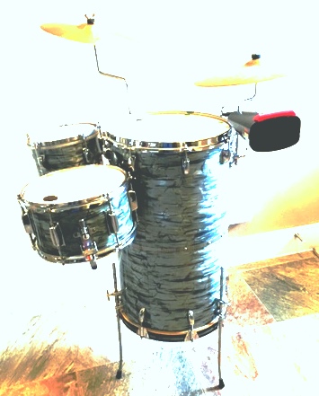 I think that I may have completed my Gretsch cocktail outfit upgrade. I now have a little set that I can play either standing up or while seated. The 14"x 24" cocktail drum began life with only a top head. I converted it to a two headed drum. It came to me with a matching 5"x 8" bongo tom, a 12" A Zildjian splash cymbal on a "Z" shaped cymbal arm, and another aftermarket accessory mount. I bought an inexpensive 6"x 10" snare drum that I wrapped to match the other two drums with some remnants given to me by a friendly forum member. I used the existing aftermarket mount to hold a cowbell. Today, I installed another mounting bracket and a new "Z" shaped cymbal arm for a ride cymbal. right now, I have a heavy 16" ride on that mount.