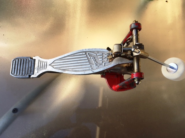 I do have a few pedals that will reverse. I didn't include the pedal I'm using with these drums in these pictures. Here it is. I love the feel of this Leedy X-L. It's very similar to older models of the Ludwig Speedmaster pedal. I have a couple of those Ludwigs and a Gretsch Floating Action that can also be reversed to use with cocktail drums. This pedal does not move around if the drum and pedal are on carpet or a throw rug. I'm working on designing a wooden plank with holes for two of the drum's feet to fit and a flange (metal? wood?) for the pedal to clamp on as if it was a bass drum hoop.