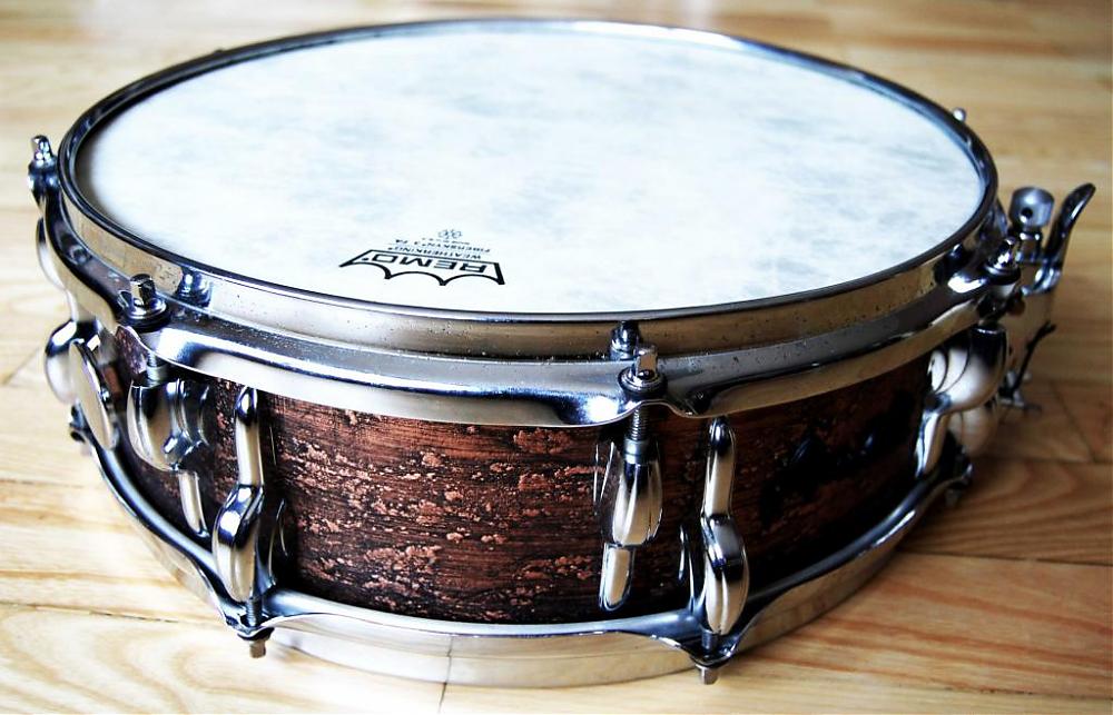 All original parts except: Snare strainer and butt had been changed to modern ones as the old ones weren't trustworthy. Tension rods changed to modern 7/32s for easy tuning. New Pure Sound snare wire. Left the inside of the shell untouched. Aged Copper-On-Wood finish!