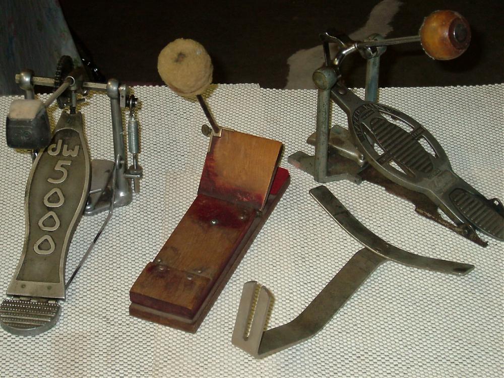 Boscoe and grezildwigland, I'm not too versed in drum company history. ThatDW pedal I bought new a long time ago. Nothing homemade on it for sure. As far as the wooden pedal, the gentleman who left it to me was a vaudeville and silent movie pit drummer. These were the innovators who first realized they were going to need to use more than one limb to cop sounds, and they had to design and build the early gear. I am told there are earlier, more crude bass pedals, but that this one is very early. The beater can be removed by loosening a very small brass thumb screw.