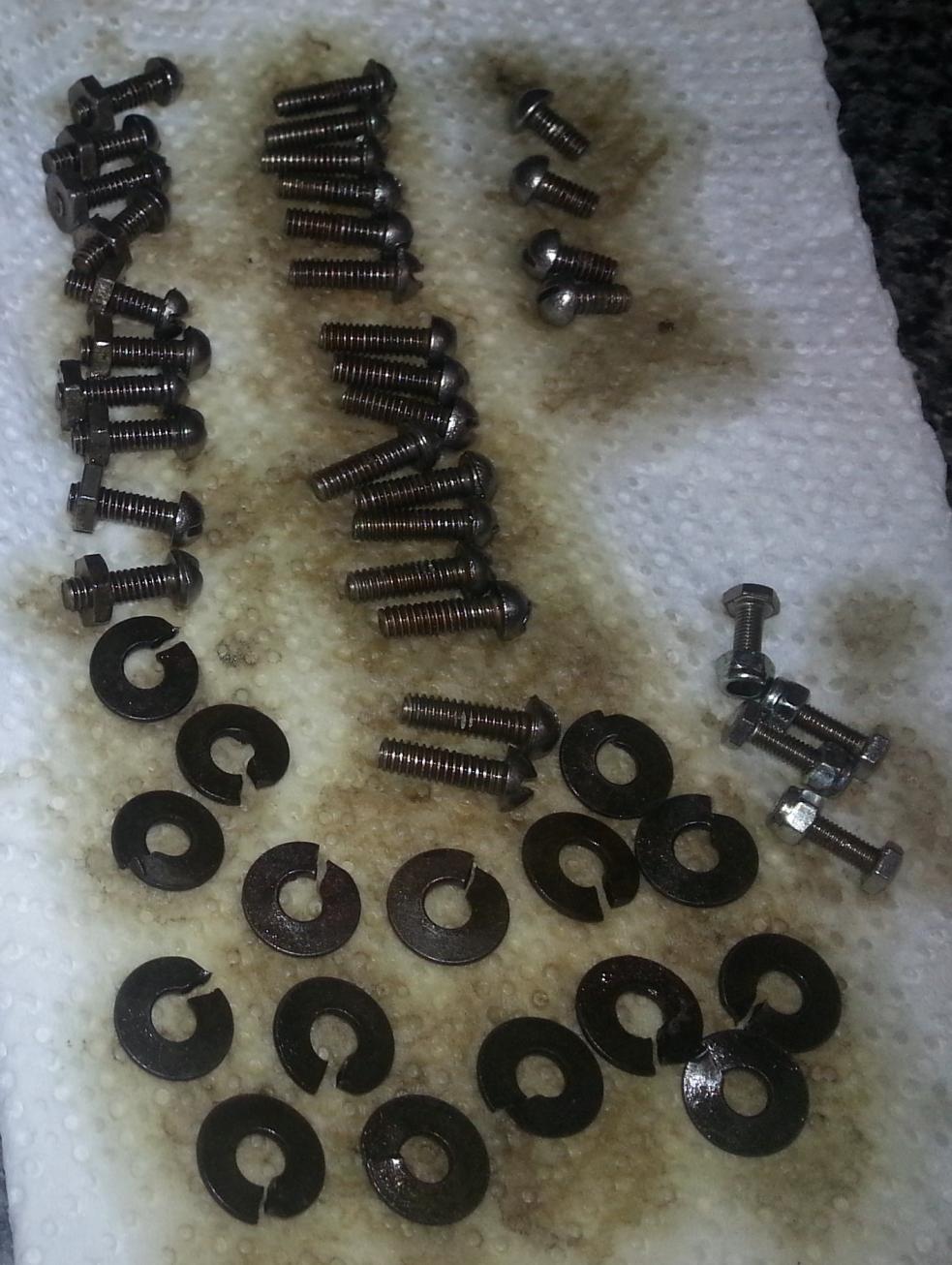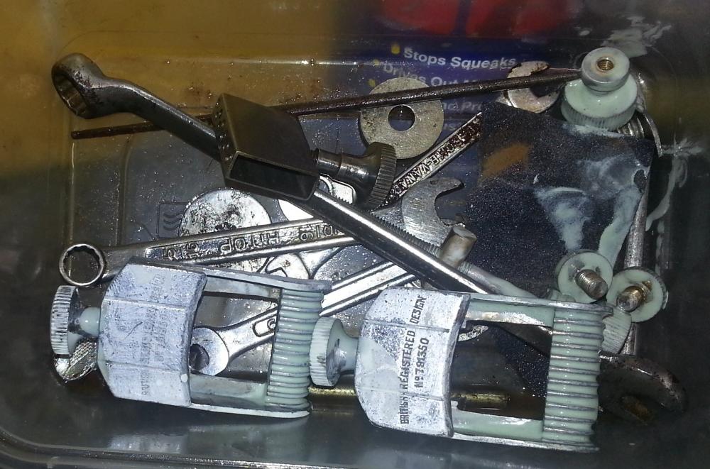 One note on white vinegar never put cast parts in, ive done it, it eats em alive. Only brass steel etc. Tension rods and washers chuck em in for approx 2 days. Rusty washers nuts bolts anything thats bad rust chuck em in for 2 days empty then repeat. I then spin em on a drill to bring them up like new. Sometimes they look pitted but once cleaned up they maintain the originality original.