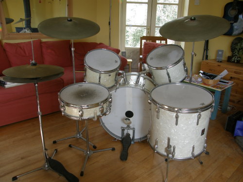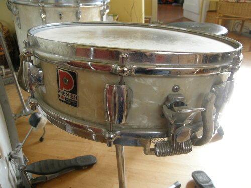 Hi, I have a vintage Premier drum kit that i think is either late 1950's or early 1960's. All the badges on the drums say 'made and reg'd in england' except the one which is on the right hand mounted tom (I believe this tom was added slightly later as the badge says 'made in england' and it has a different mount. (The drum looks almost identical to the other mounted tom but i know originally there was only one.) The cymbals say 'zyn' and 'super zyn'. It's in fairly good condition and has been played as a hobby by me for the last 10 years (was given it as a birthday gift). The drum shells are wood, i think the finish is a white/cream pearl. It also has 3 Premier hard cases with it.