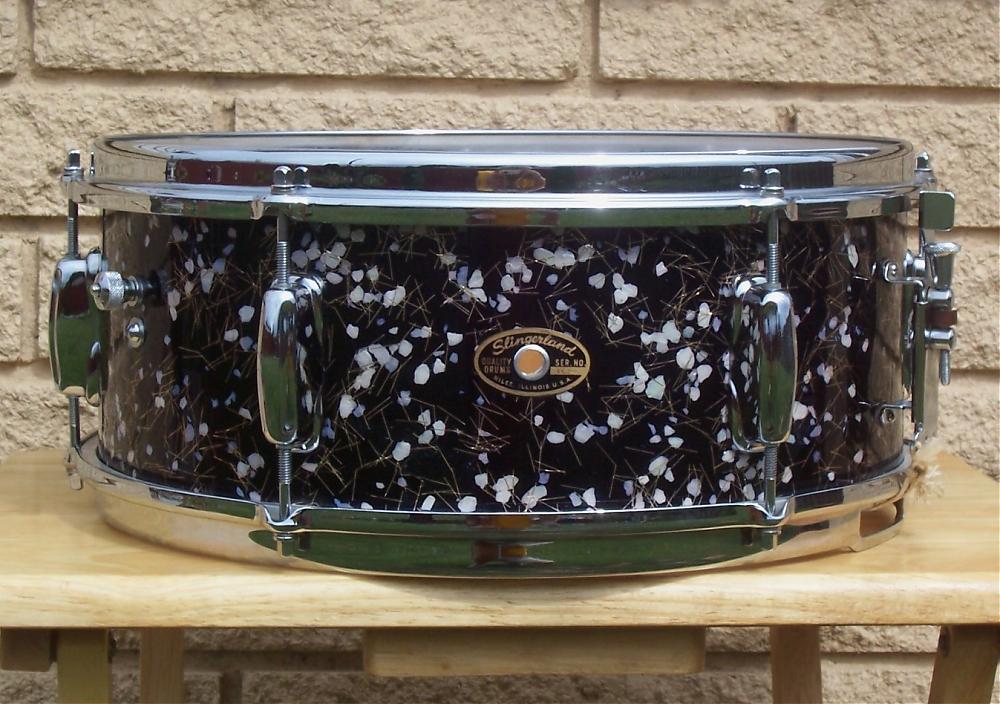One of my recent "finds." This one's all original, including the heads. It's my understanding that Slingerland only offered this particular wrap from 1958 through 1963. I'm always looking for vintage drums that are somewhat unique or "out of the norm" so I feel very fortunate to have found this one. I haven't seen too many being offered with this particular wrap. It actually shows better when seen in person. Now I'll have to find "the rest of the family" -- a couple snare drums in Slingerland's Fiesta and Mardi Gras Pearl finishes. THANKS for looking!
