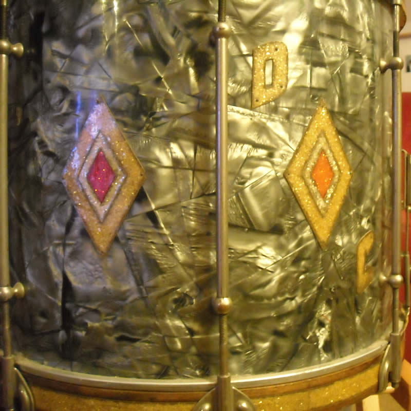 I'm hoping someone can tell me a little bit more about the vintage Slingerland marching drum which was made for my late, great uncle. From what I've been able to see on the Vintage Drum website it looks to be from the 1930's and has a Diamond Pearl body with sparkling gold, silver and red "three tone" diamonds. It also has wooden hoops with sparkling gold inlays.