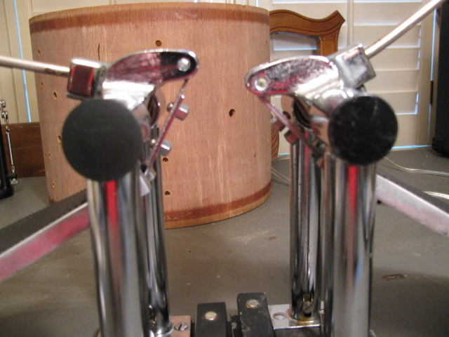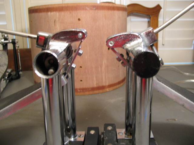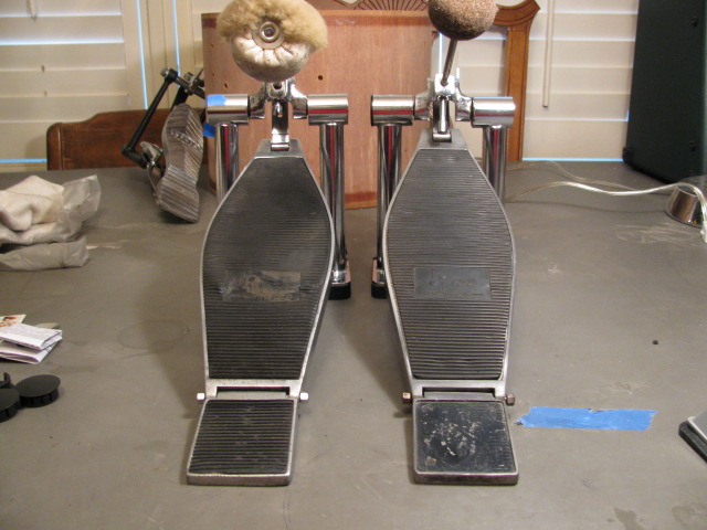 I just finished restoring or maybe I just detailed the early 60's Sonor teardrops. I didnt really have to replace anything. I took em' apart and shined everything and put em' back together. In the mean time i found a vintage sonor bass drum pedal to go with my hi hat and snare stand that I got with the kit. I got it in and was awed by the heavy dutiness of this piece of hardware. I took it apart and shined the sh*t outta it. It turned out very nice. I found another one the other day and got it too. I figured Id have it for a fellow forum member someday. I got it today and it was in much better shape than the one i already have with the exception of the rubber on the pedal. My 1st pedal's rubber is perfect, but the chrome and powder coat is pitted and worn. My 2nd pedal is perfect with the exception of the rubber on the pedal, YOU GOT IT! Im gonna make a perfect pedal outta the 2 pedals. I am so pleased. L@@K
