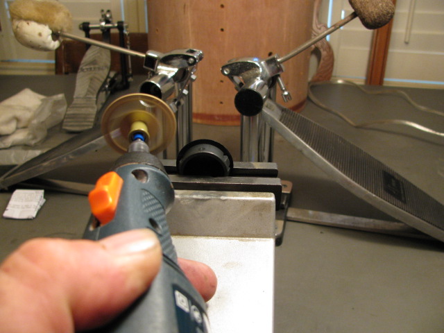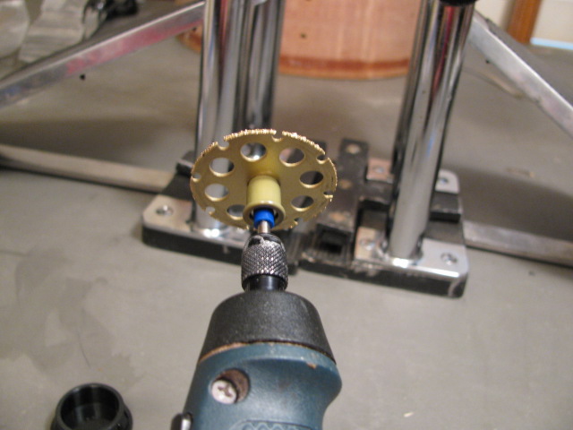 Both pedals were missing the black plastic plugs that plug in on the sides. I found some plugs at lowes that will fit, but I have to cut some of the depth of the plug away to accomidate the movement in the shaft. I also got to use my new dremel saw blade, and my suction cup vise. lol