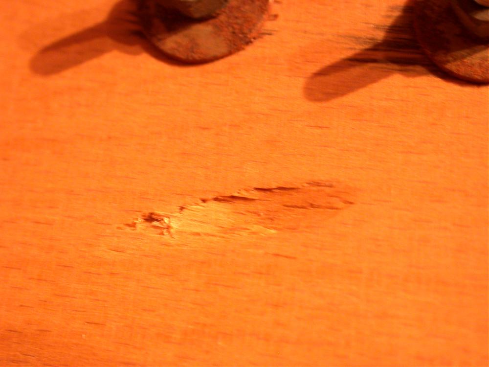 Well, during a probably violent throw of the parcel by some shipper, the foot of the snare stand impacted the iside of the very thin Beech shell and punched the outer ply right through (see pics). The outer ply's damage is about 3/4" long and 1/2" wide.