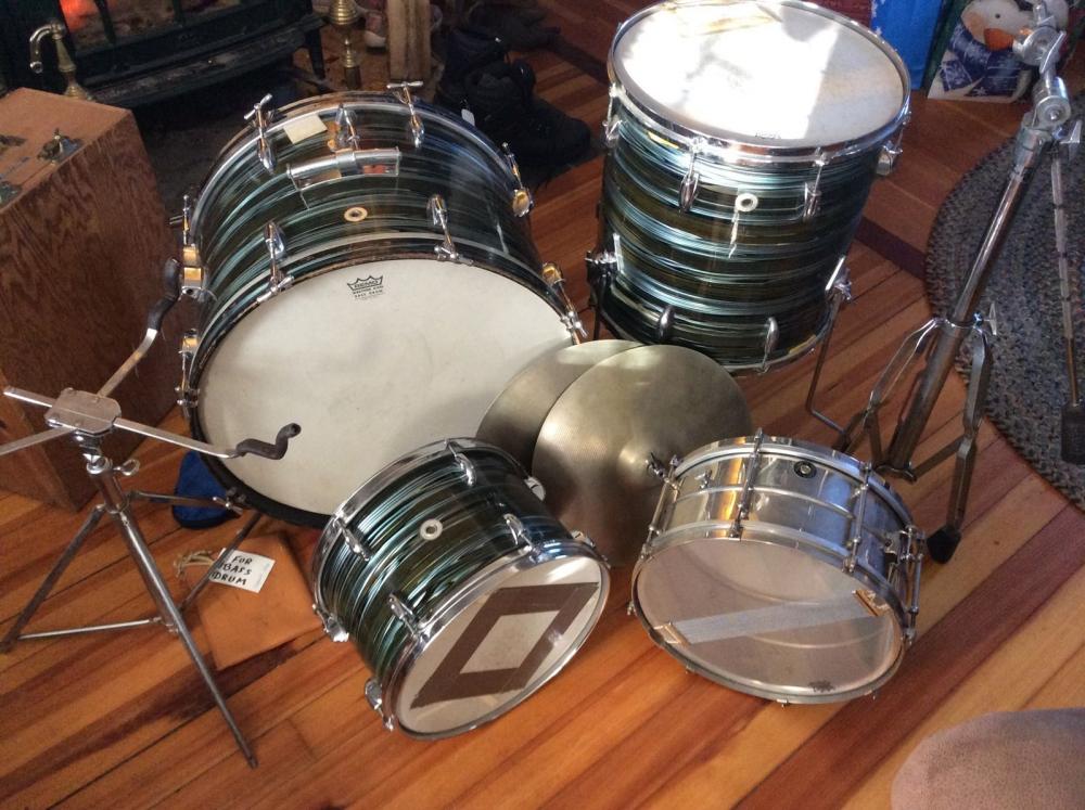 Cruising the sold listings for Leedy drums on eBay, I noted this set with interest because of the finish on the W&A drums - looks like the blue strata used on Ludwig Standards, and also the Leedy snare. Entire set on a single bid for $1500. Of course, it was local pickup in northern Maine.