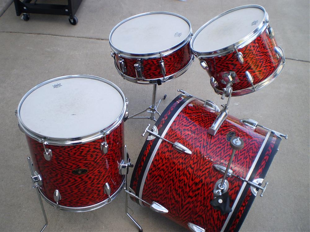 That is awesome! So together and complete! Nice find! I've got an Astro snare in blue onyx that's a close cousin of these. (It's in pieces right now, need to find a free afternoon to get it together.)Are those Ambassadors or Emperors on the batter sides?Is this set a keeper? With that wrap, it should be.If you would, could you post a close up pic of the snare strainer?