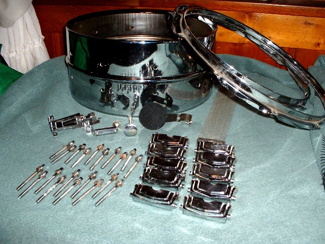 I got this Ludwig 402 off Craig's List last week for $40. This is what it looks like after a total disassemble, cleaning, polishing, removing some tarnish, the repair of a broken throw off lever, and a new batter head. It's a great sounding drum.