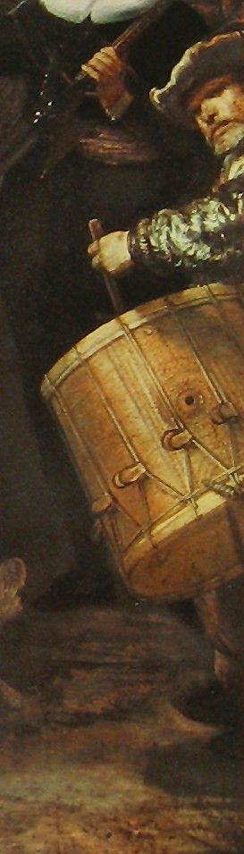 Here's a brightened-up detail of Rembrandt's Night Watch showing the drum you're referencing: