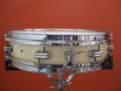 I'm attaching a photo of a lovely WMP 'pancake' snare I recently acquired. I haven't a clue who made it. It has some marks where a badge may have been around the vent hole. It is 6 ply, 8 lug and the lugs are solid cast with the throw shown and a premier style butt. My guess is John Grey perhaps an Autocrat because of the build quality.