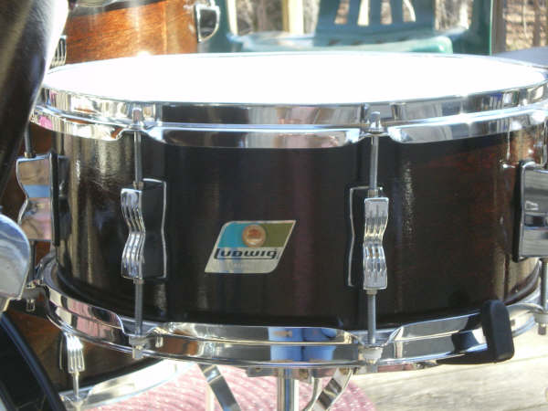 The badge is a b/o which makes the drum a 70's era....BUT....it IS set in the wrong position. Also, the shell appears to be painted black (?) the lugs are Luddy.