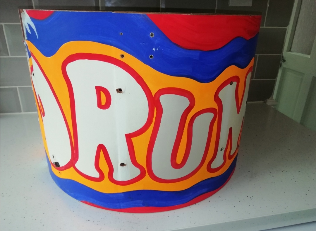 I thought I'd share this funky drum wrap before it disappears. I'll probably remove it, which is a shame, because its somebody's artwork. It's a nice, African Mahogany Premier Bass drum. 20". The wrap is pasted on there real good.