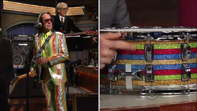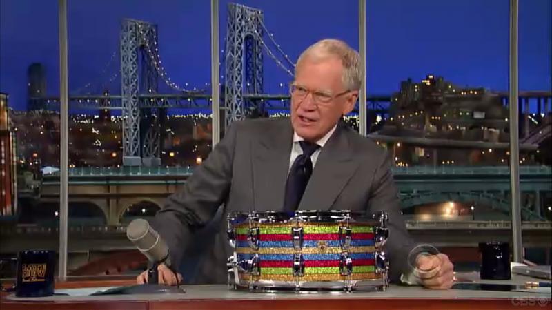Did anyone watch David Letterman last night (May 7)? Letterman was making some jokes about Todd Rudgren's multi-colored jacket, saying it was a "saleman's sampler" (one that showed off all the available fabrics). After a commercial break, he says he has another "salesman's special". He then opens a snare case on his desk and pulls out a beautiful, rainbow patterned, multi-colored Ludwig snare (wish I had a screen shot).