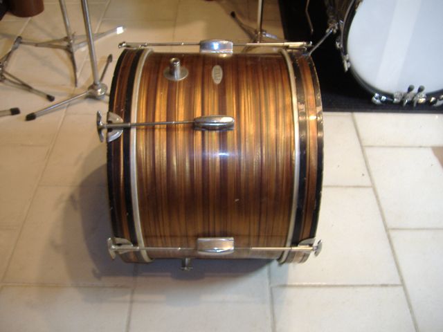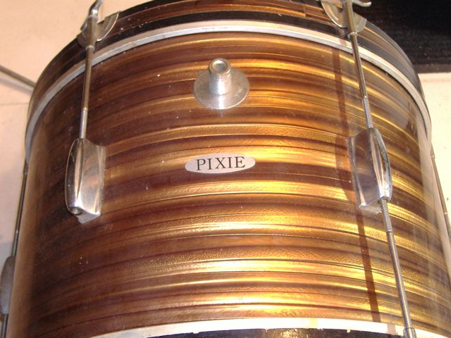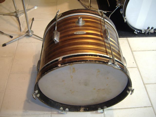 Picked up an 18" x12" Pearl Stencil a while back. Tigers eye pearl, 3 ply with re-rings, single row, six lug. Nice shape, still haven't found a use for it. Badged; PIXIE. Figure it was probably part of a junior kit from late 60s, (had newspaper from 69 inside).