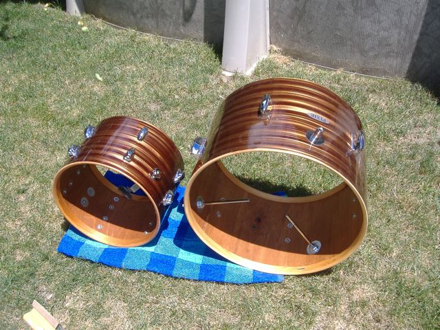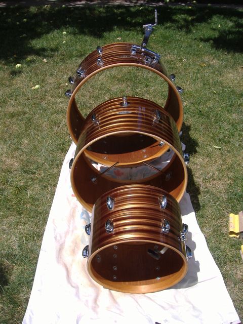 Don't have any final, beauty shots, but here are some from when I first got the drum, and a couple after polish, and tung oil treatment. Did shell along with the matching Coronet kit, (sold). Refinished hoops, and replaced missing t-rod, and it's like new. Got stacked in back room right now.