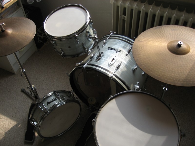 1972 or slightly before. Used to belong to Hotel Imperial in Karlovy Vary (Karlsbad). MINT CONDTITION. 6ply beech. 20"x14", 12"x8", 16"16", 14"x5". 15" hats and 20" ride, brass. Deep, thumpy 70s sound.