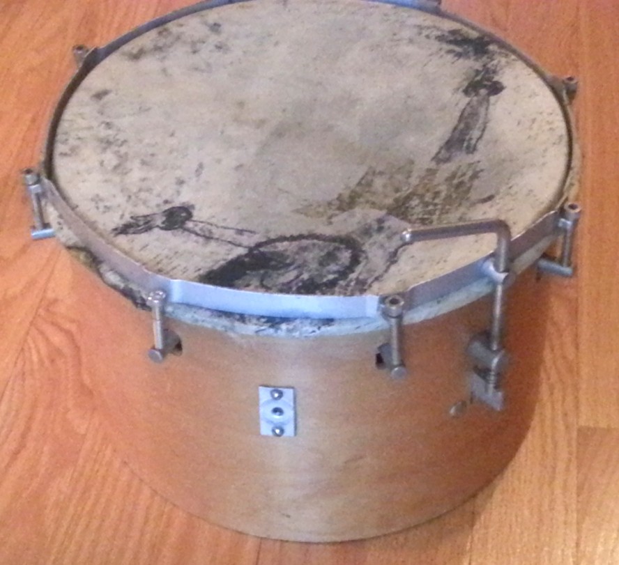 Sorry I missed you. Joe Montineri showed me the drum you returned to him, and I'm calling him to have a 5x14 shell made. I picked up a strange novelty drum from the center vendor which Joe's booth was facing. This vendor had a lot of strange odds and ends, and this drum just caught my eye (pics below). I don't think it's vintage; maybe some homemade concoction? It's 18" in diameter, calfskin head, with a single-crank internal tuning mechanism like a timpani. The crank pulls all the tension rods down uniformly. No idea what I'm going to use it for, but I can't resist something out of the ordinary for a bargain price.