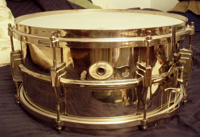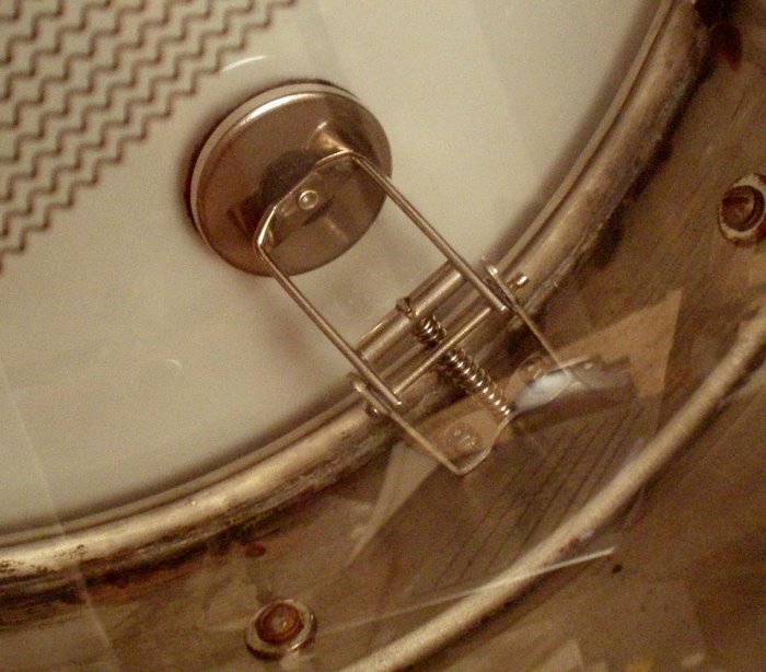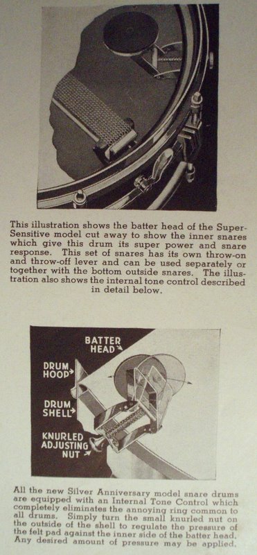 Ludwig doesn't even SHOW a snare drum tone control/muffler in any catalog until 1955... however, exterior mounted bass drum mufflers ARE SHOWN and available as far back as 1935, which is how far I went back. Leedy & Ludwig DO SHOW and offer a snare drum tone control in 1953 though, although WFL does not... but WFL OFFERED THEM if the customer was so inclined!, and for no extra charge either. As mentioned previously, the dealers did a lot of these after purchase installations, and with W&A being the largest manufacturer of this stuff, it's no doubt why a lot of these tone controls are the same.