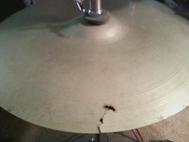 Looking for a new 15" Paiste top hi hat cymbal. I have a set of old Ludwig Paiste 3 star logo Swiss made hi hats. The top cymbal cracked and is at the point I really need to find a replacement. As you can see it's pretty shot. Would even consider a pair of them if not too expensive. These are from the 1958-1960 timeframe looking at the Paiste timeline. Thought I'd look for one before I retire them and look for something else. If anyone has something please let me know~! :) I'll get the exact weight of mine asap. If I had to guess it's in the 600-700 gram range.
