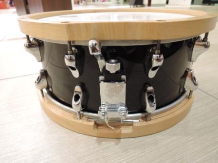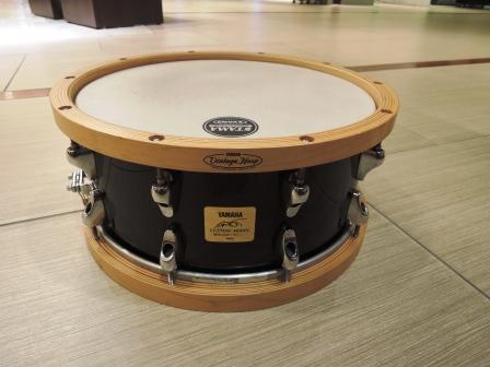 The Anton Fig signature snare drum is 14x6 and has a 7-ply maple shell with 20 small light-weight lugs and a standard type butt-plate. The snare mechanism is of average size and is mounted at a small nodal point with two screws and works well with no fuss. The one obvious feature of this drum is the Vintage Wood hoops. These are made of 19-ply maple and are coated in a special urethane finish to increase their durability. The drum is in a solid black finish.