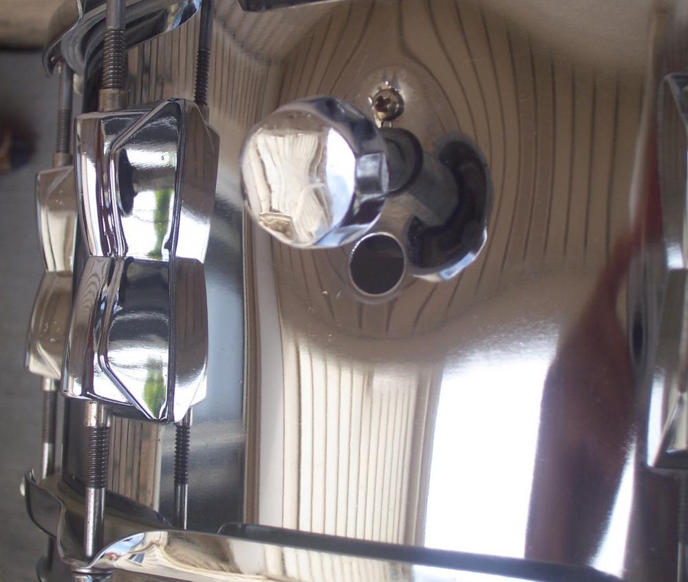 So, the other day I was fortunate enough to pick up a late '60s - early '70s Star kit for free that came with a Yamaha 6.5 x 14 steel snare. Knowing absolutely nothing about Yamaha snares, I did a little research and discovered that it's apparently a SD246 model. It was in pretty filthy condition when I got it, but it cleaned up rather nicely. I actually like the sound of it, also. However, the snare has a tone control installed that obviously wasn't original to the drum (see attached pics). I tried unsuccessfully to find some pics of the identical model to determine what type of tone control was original to the drum. Unfortunately, the pics I found didn't show a tone control on the respective drums. I'm hoping that someone out there might be able to tell me whether this drum had a tone control installed when it was issued from the factory. If so, would any of you happen to have a pic of the "correct" tone control, since I'll be looking for one? Thanks in advance for your time and your help!