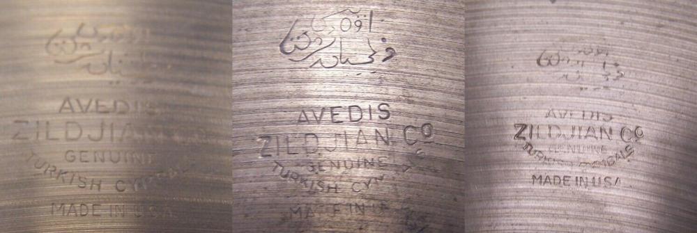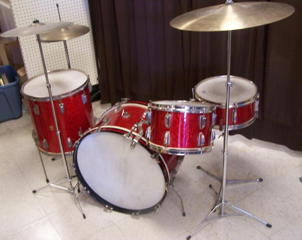 The cymbals were a 20" ride, 16" crash and 14" hats. They were paper thin and from the same era as the drums. (See the pic of the cymbal badge stamps).