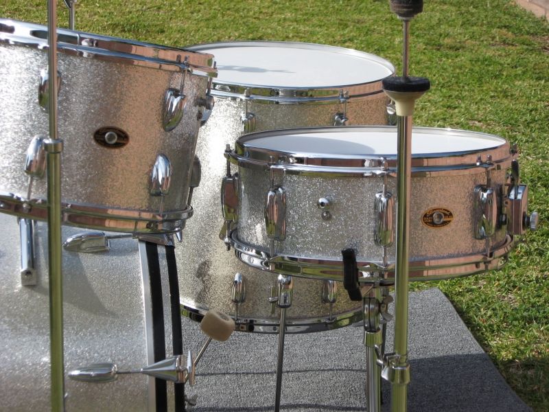 Here's my gorgeous 1967 4pc Slingerland kit in original Sparkling Silver Pearl! The killer snare drum is a steam-bent solid maple Vaughncraft shell, with all the hardware donated from the original Artist snare drum. Yes, I still have that shell...and keeping it! Oh yeah, the rail consolette is from Steve Maxwell. Really looks and works great!