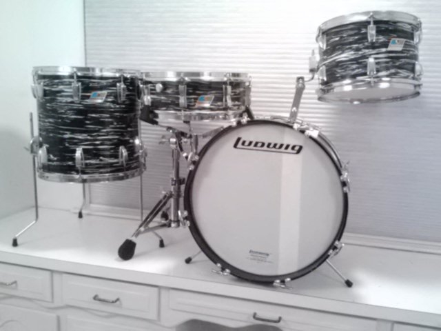 I have several other sets but first here is one of my favorite kit, I think VDF readers will enjoy it’s a extremely cool looking Black Oyster Pearl (bowling ball) Ludwig Jazzette Bop Kit. I believe it’s from the early to mid 1970's. I have never tried to restore it after all these years. It’s in its original condition just like I received it the day I got it in 1986 dust balls and all.