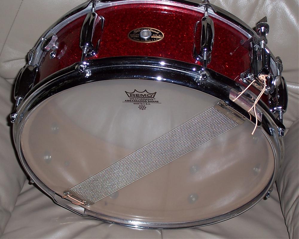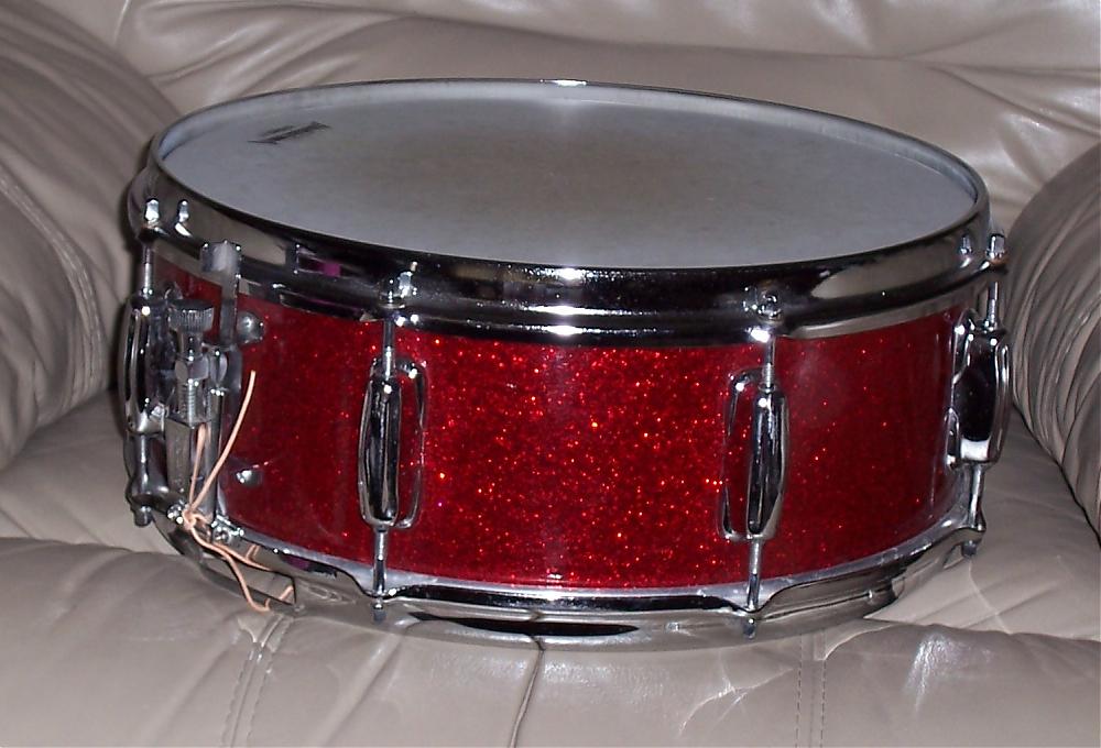 I've got a 60s red sparkle Slingy Hollywood Ace for sale. I'm asking $250 (+ship). The prior owner mounted a Ludwig strainer on the shell but did NOT drill any extra holes to do so. I believe that I've got a Slingy Rapid strainer that I'll include with the drum along with the Ludwig strainer. The wrap's in excellent condition. The drum's got the Black & Brass Niles Badge (SN 194841) and original tone control. I believe that the bottom rim is an original Slingy COB stick-saver. The batter side rim is NOT a COB and I'm not 100% certain that's it's an original stick-saver. It may be a copy. The snare wires are Pearl. Interior shell's got the "chocolate milk shake" paint. If you'd like to see more pics drop me a PM and I'll get them out to you. THANKS for looking!