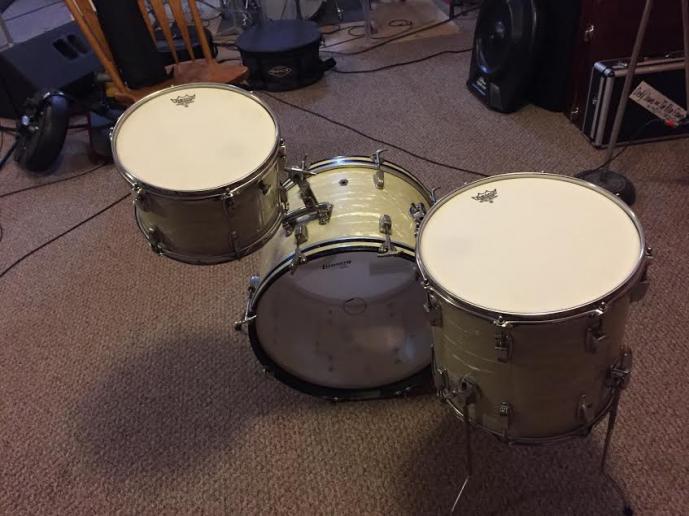 A drummer friend of mine is having some health issues and has decided to sell some stuff. Of interest to you vintage users/collectors is this 1965 Ludwig WMP kit in 12,14,20. Yeah, 14x14 WMP Keystone badge (1965) floor tom that comes with a 12x8 tom and 14x20 bass drum. I say that because I think the whole kit price is about that of the 14x14. He said the serial numbers put the kit in 1965. He played this kit from time to time but it has been sitting since he got two new Ludwig kits in the same sizes. 14x14 and 12x8 are chrome hardware and the 14x20 is nickel. At one point the spurs were changed to newer curved ones but has been put back to original fold down mounts with new spurs. This is a very good condition players kit. Please contact him directly for purchase details at: [email]century80@gmail.com[/email] He is a motivated seller.