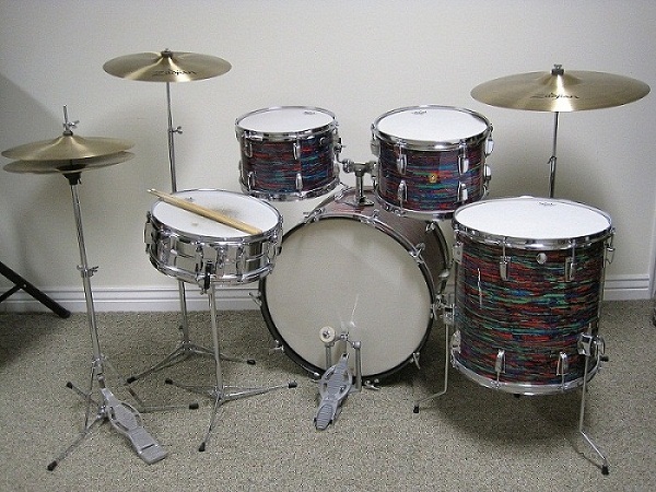 The wrap was in good shape when I bought them. The most fade is on top of the bass drum. I thought about doing the green Sharpie technique, but then the feeling went away. I removed all the hardware, polished the wrap with Novus. I replace the BD post bracket with one that is period correct. Removed all the rust, and replaced 2 hoops, and several lugs that had cement rash. I also replaced several tension rods and washers with period correct rods and brass washers. And replaced a few T rods and claws. On reassembly I put felt under the lug springs, and waxed everything with turtle wax. Then I set them up to take the pic. Then I set them up to play and hit them a lot with sticks. They sound great. Here's another view.