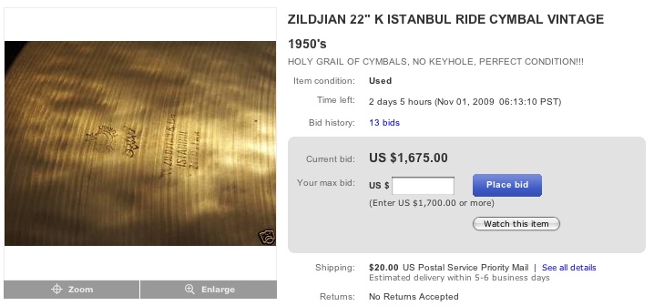 How can one justify those prices for any cymbal without hearing it? No sound clip in the listing?? Just because its an old K doesn't mean its worth that much....it could sound like a trashcan lid!! Then all you have is a $1500 trashcan lid! No thanks, you guys can keep it, I'll stick with my NEW K Customs, at least I know those sound good and are affordable!